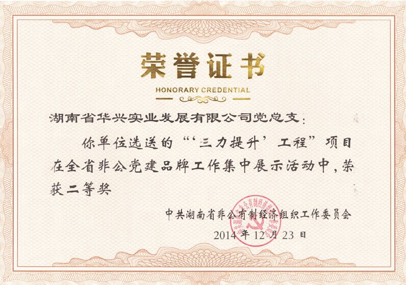 12月23日,湖南省华兴实业发展有限公司党总支选送的“三力提升”工程项目在全省非公党建品牌工作集中展示活动中,荣获二等奖。