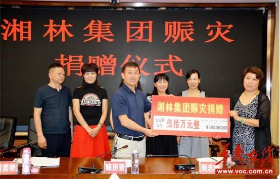 7月26日,省人大代表、省工商联执委、市县工商联副主席、湘林集团有限公司副董事长、总经理周志梅女士向新邵县赈灾捐款50万元。新邵县委副书记、县长陈历贤,县委常委、统战部长何美艳,县政协副主席、工商联主席何燕燕等出席捐赠仪式。